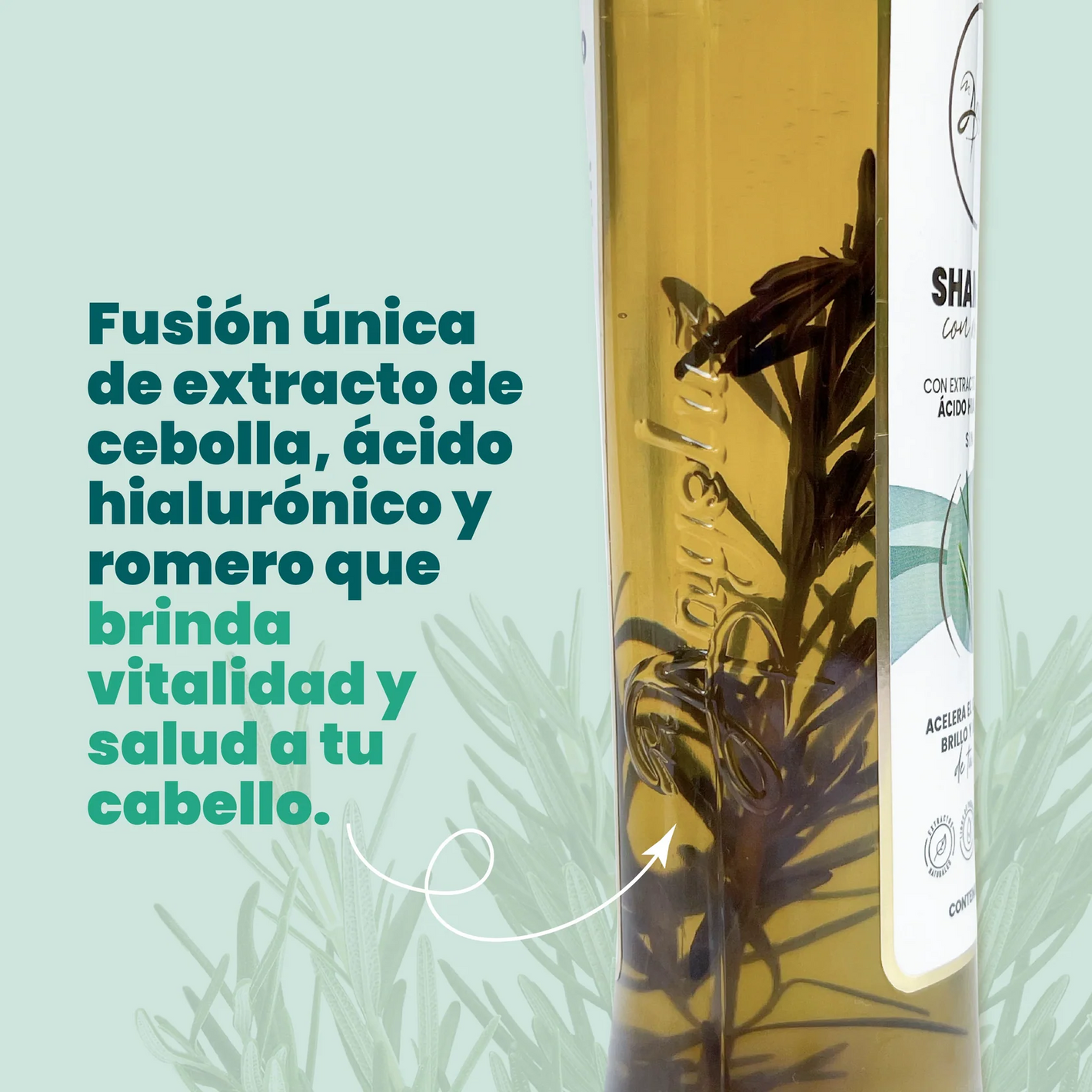 El Shampoo de Romero Anyeluz esta formulado con ingredientes naturales como estracto de cebolla, acido hialuronico y romero puro, diseñado para transformar tu cabello desde la raiz